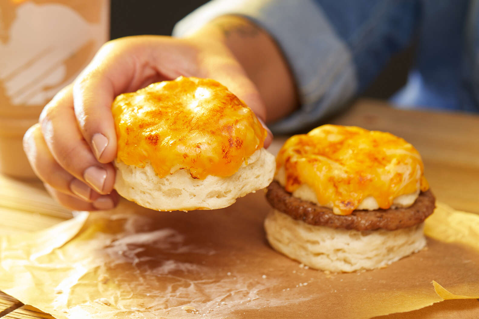 They’ve got two versions: A plain buttermilk biscuit with cheddar, mozzarella, and pepper jack cheese melted over top of it, and one that’s cut in half with a sausage patty in the middle.